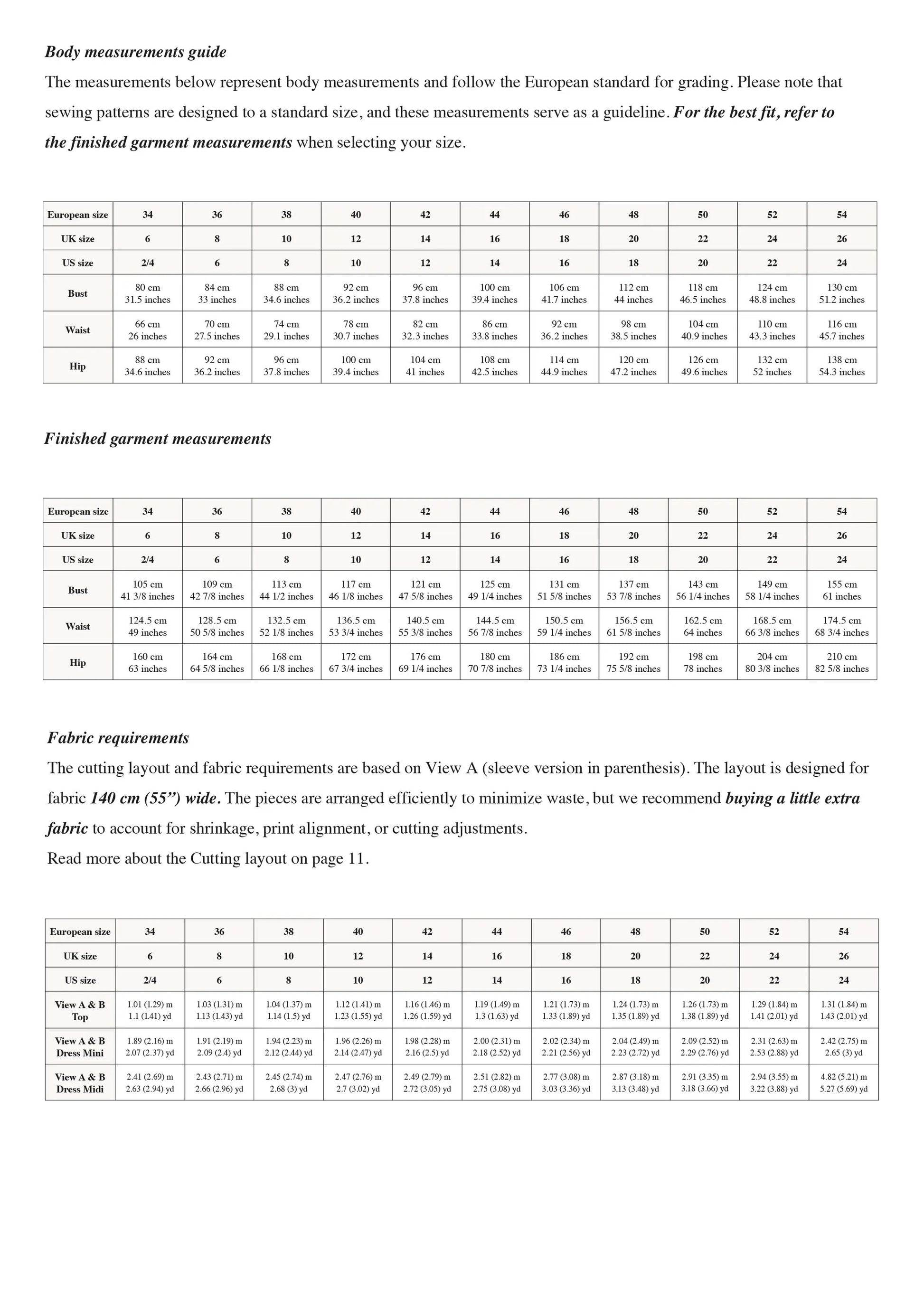 The cutting layout and fabric requirements are based on View A (sleeve version in parenthesis). The layout is designed for fabric 140 cm (55”) wide. The pieces are arranged efficiently to minimize waste, but we recommend buying a little extra fabric to account for shrinkage, print alignment, or cutting adjustments.