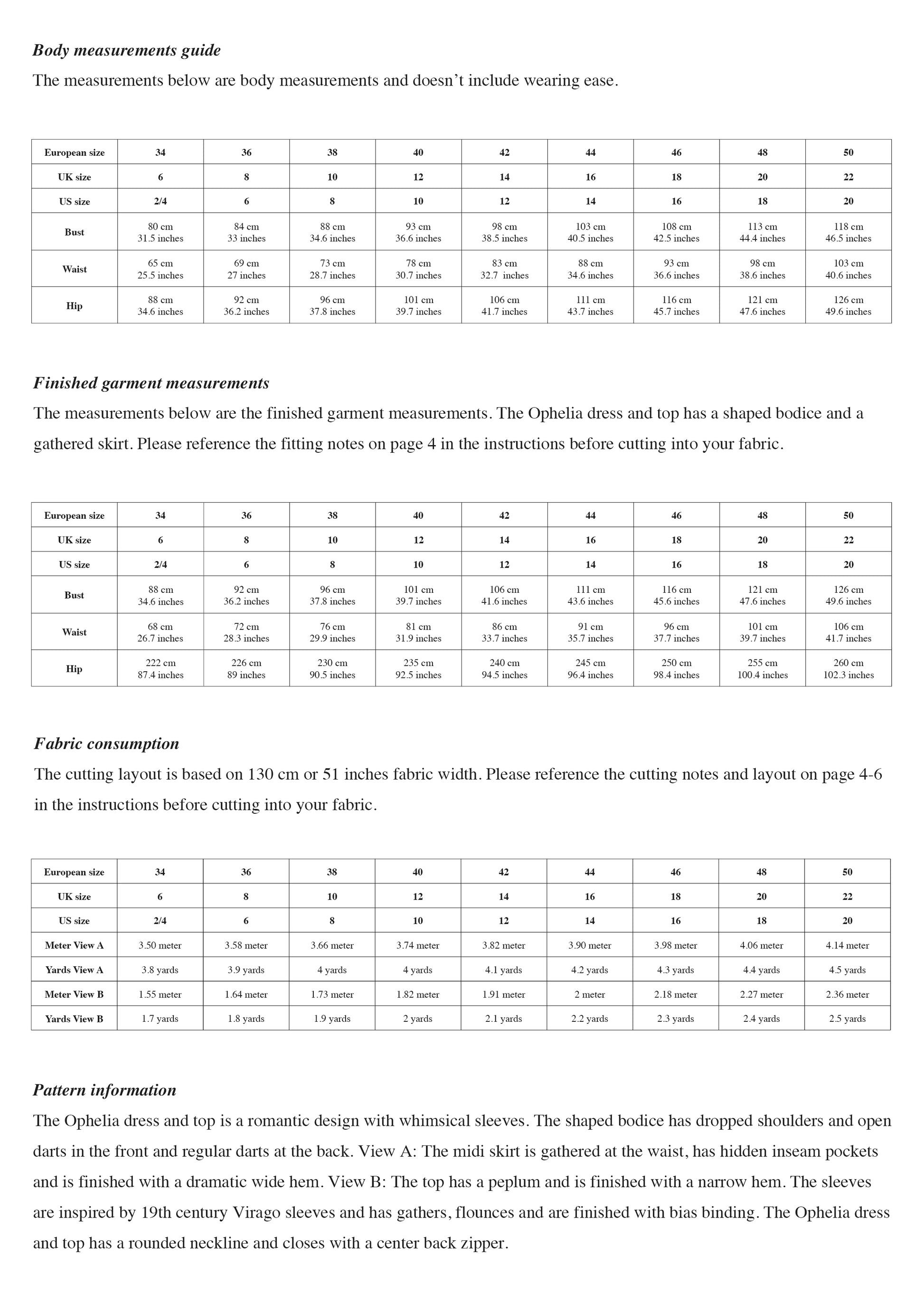 The Ophelia dress and top is a romantic design with whimsical sleeves. The shaped bodice has dropped shoulders and open darts in the front and regular darts at the back. View A: The midi skirt is gathered at the waist, has hidden inseam pockets and is finished with a dramatic wide hem. View B: The top has a peplum and is finished with a narrow hem. The sleeves are inspired by the 19th century Virago sleeves and has gathers, flounces and are finished with bias binding. The Ophelia dress and top has a rounded neckline and closes with a back zipper.