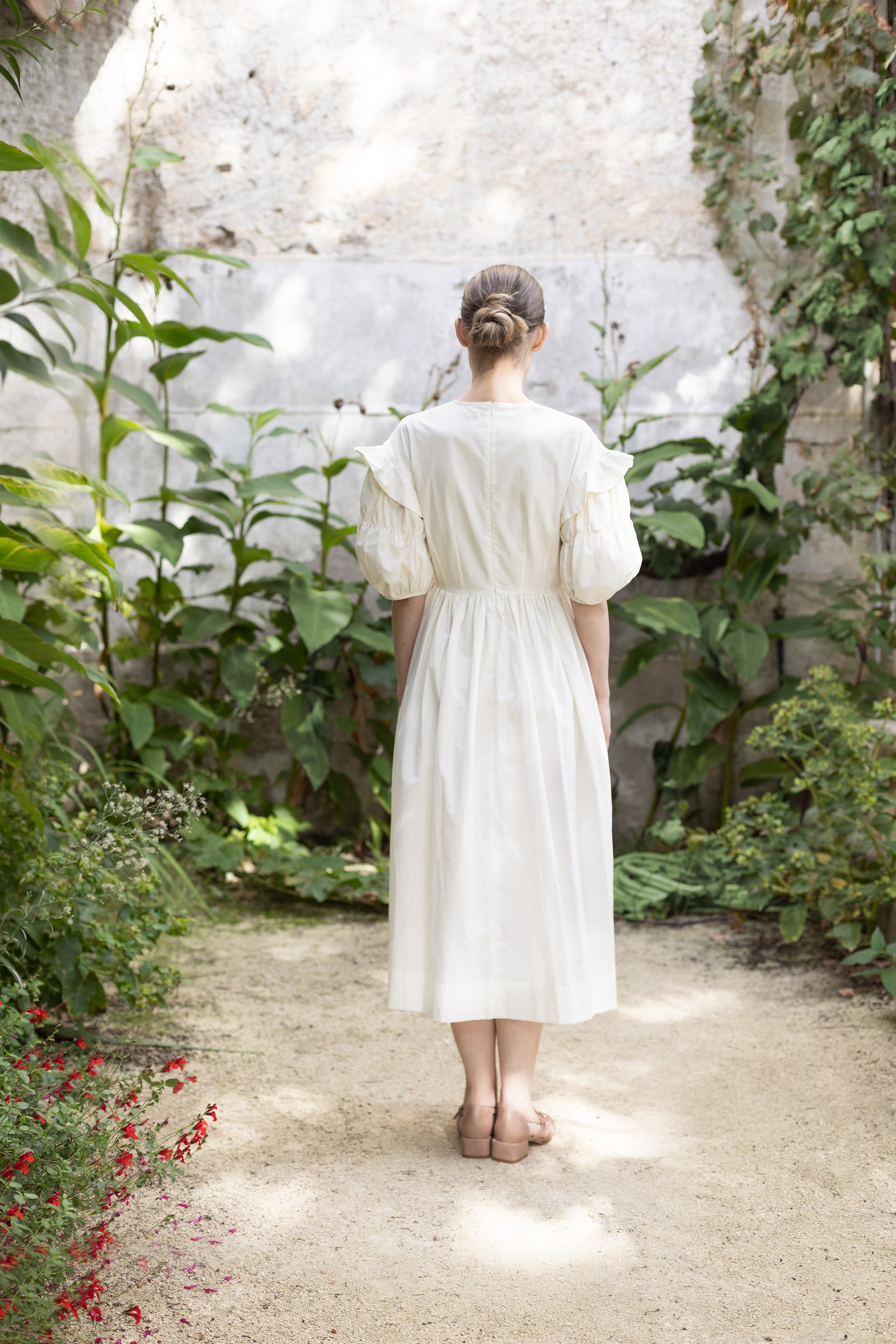 - Shaped bodice with darts, dropped shoulders and a gathered skirt with hidden inseam pockets